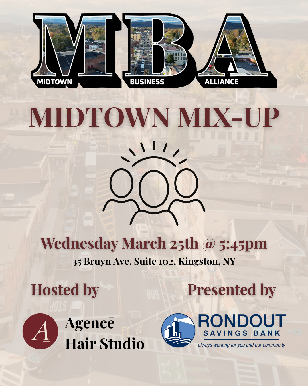Our next Midtown Mix-Up will be on Wednesday, March 25th at 5:45pm, hosted at Agencē Hair Studio, located at 35 Bruyn Ave Suite 102. This event is presented by Rondout Savings Bank.